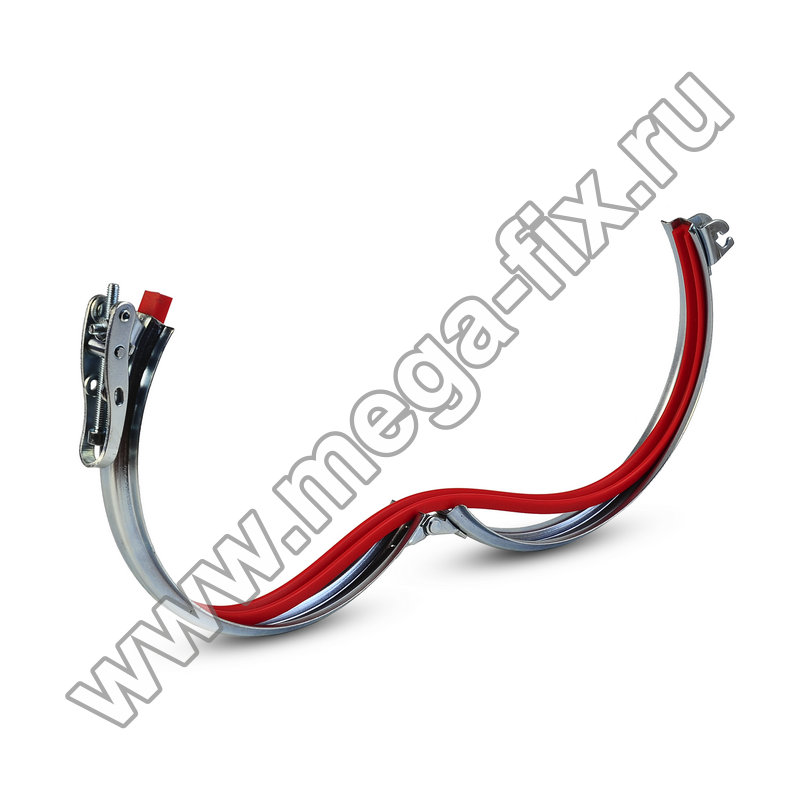 Хомут представляет собой два стальных полукольца, дополненных шарниром с клепкой, а так же быстроразъемным замком, оснащенным рычагом. Рычаг обеспечивает оперативный монтаж без необходимости использования каких-либо инструментов. Внутри хомута установлен поливинилхлоридный профиль, гарантирующий герметичность соединения.